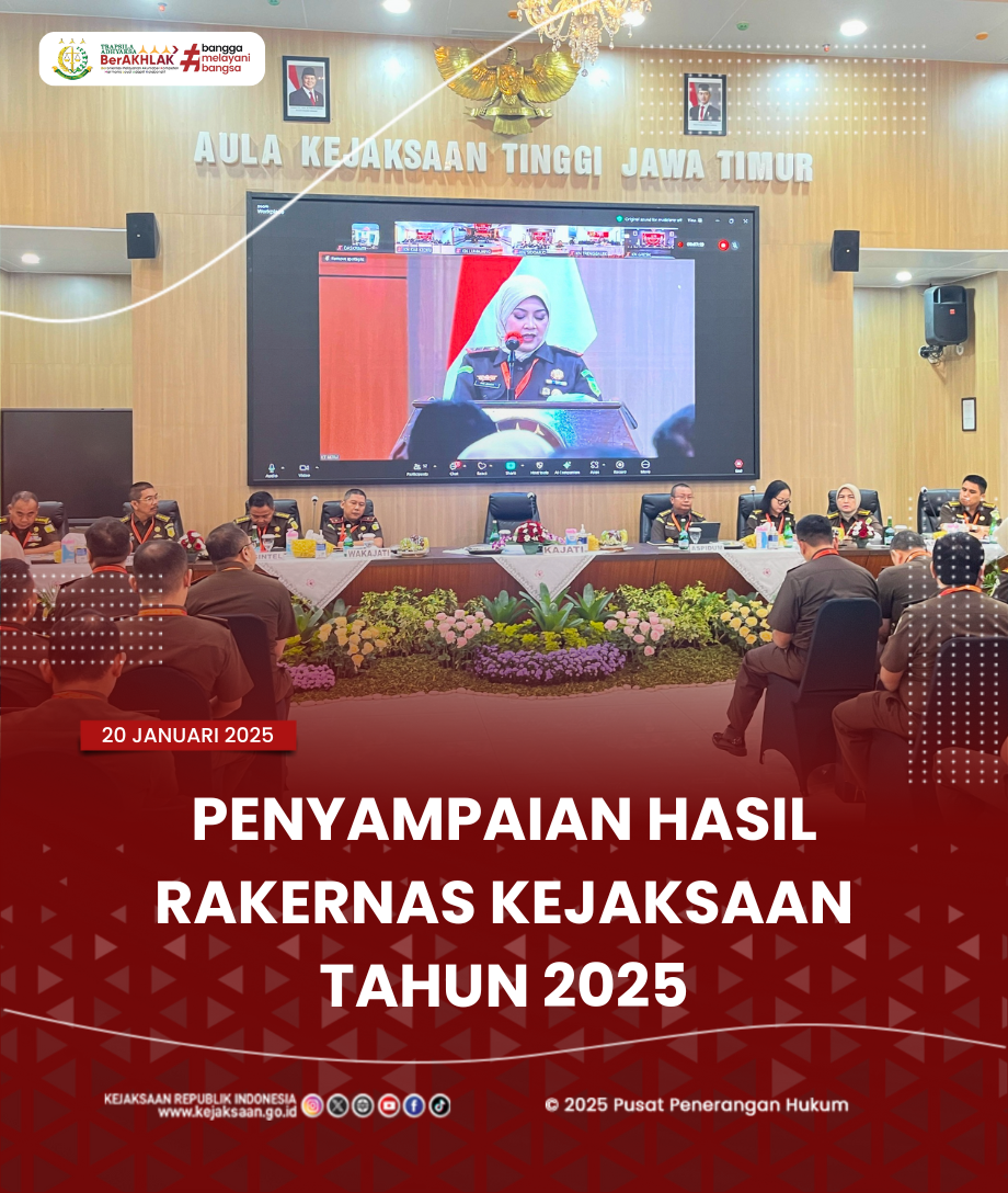 Senin, 20 Januari 2025. Kepala Kejaksaan Negeri dan Jajaran Kasi Kejaksaan Negeri Pamekasan menghadiri acara Penyampaian Hasil Rakernas Kejaksaan Tahun 2025 di Aula Kejaksaan Tinggi Jawa Timur.
