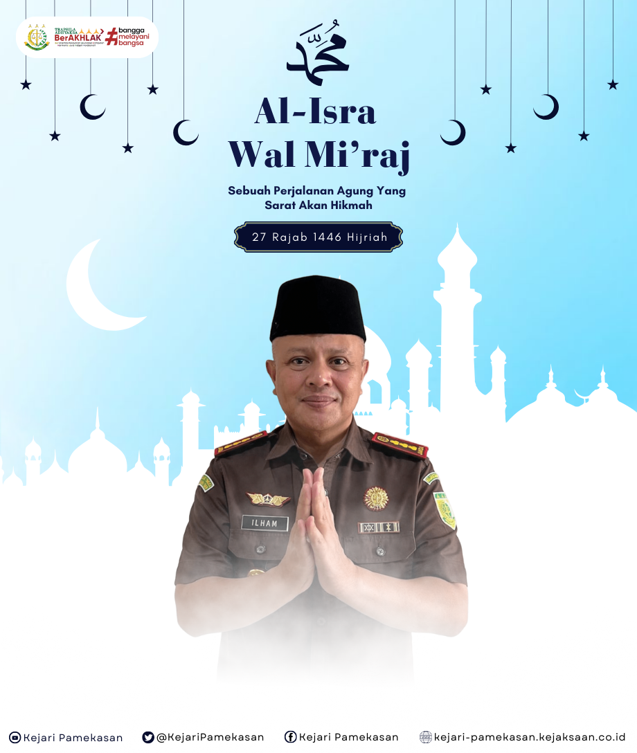 Memperingati Isra Mi’raj admin January 30, 2025 1 min read Kepala Kejaksaan Negeri Pamekasan beserta jajaran mengucapkan Selamat Memperingati Hari Isra Mi’raj 27 Rajab 1446 Hijriah. Continue Reading Previous Previous post: RAKOR PAKEMNext Next post: Tahun Baru Imlek Leave a Reply Cancel replyYour email address will not be published. Required fields are marked *Comment * Name * Email * Website Save my name, email, and website in this browser for the next time I comment. Related News HUT RI-80 HUT RI-80 August 17, 2025 August 7, 2025
