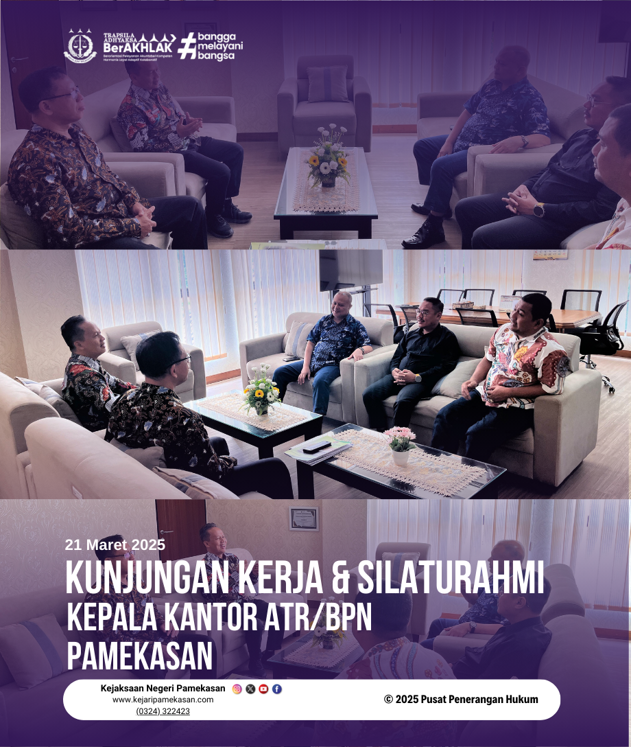 Jumat, 21 Maret 2025, bertempat di Kantor Kejaksaan Negeri Pamekasan, Kepala Kejaksaan Negeri Pamekasan dan Jajaran menyambut kunjungan kerja dan silaturahmi dari Kepala Kantor Agraria dan Tata Ruang/Badan Pertanahan Nasional Kabupaten Pamekasan.