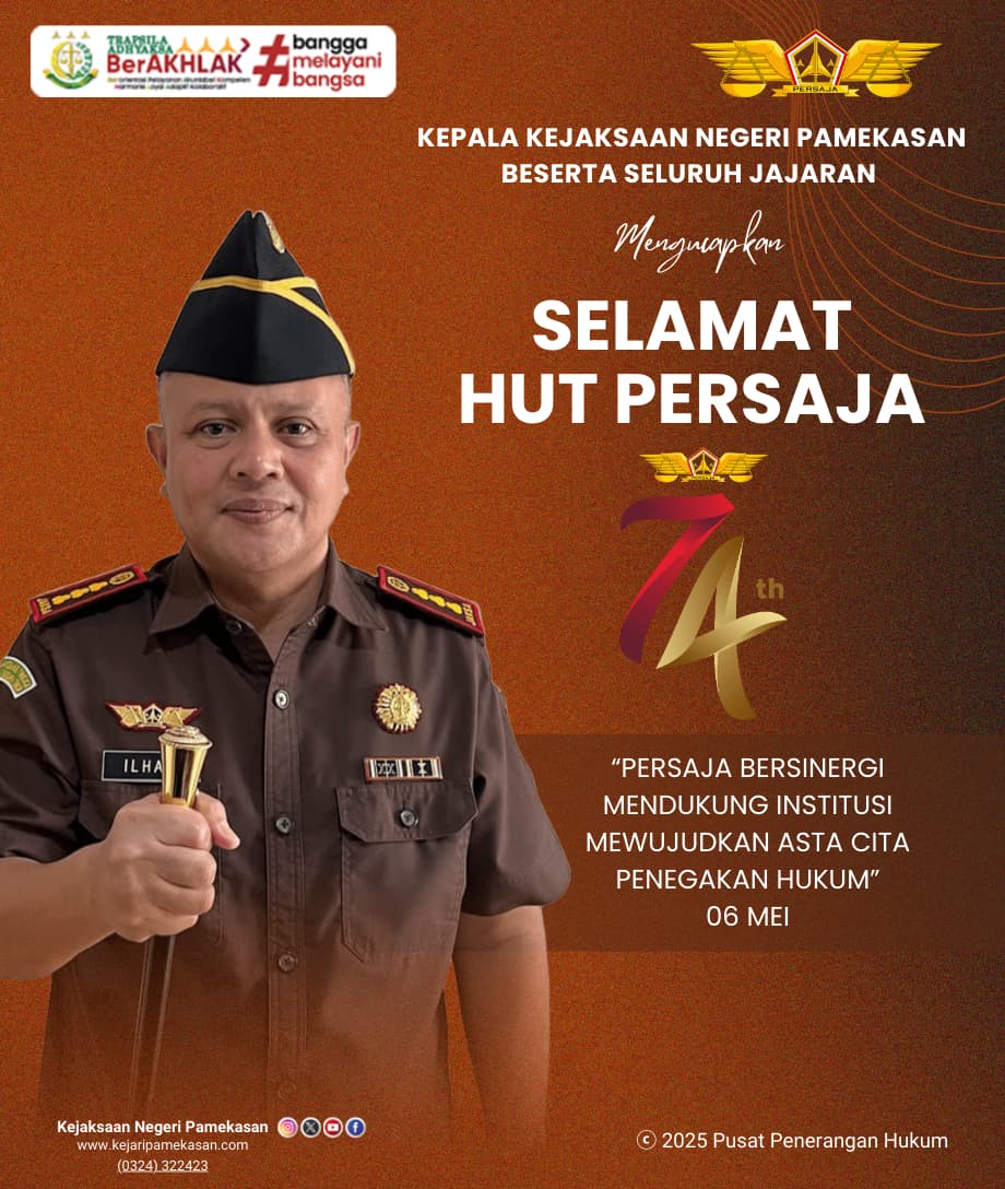 HUT Persaja Ke-74 admin May 7, 2025 1 min read Kepala Kejaksaan Negeri Pamekasan beserta jajaran mengucapkan Selamat HUT Persaja Ke-74. “Persaja Bersinergi Mendukung Institusi Mewujudkan Asta Cita Penegakan Hukum” Continue Reading Previous Previous post: JMSNext Next post: PELANTIKAN Leave a Reply Cancel replyYour email address will not be published. Required fields are marked *Comment * Name * Email * Website Save my name, email, and website in this browser for the next time I comment. Related News HUT RI-80 HUT RI-80 August 17, 2025 August 7, 2025