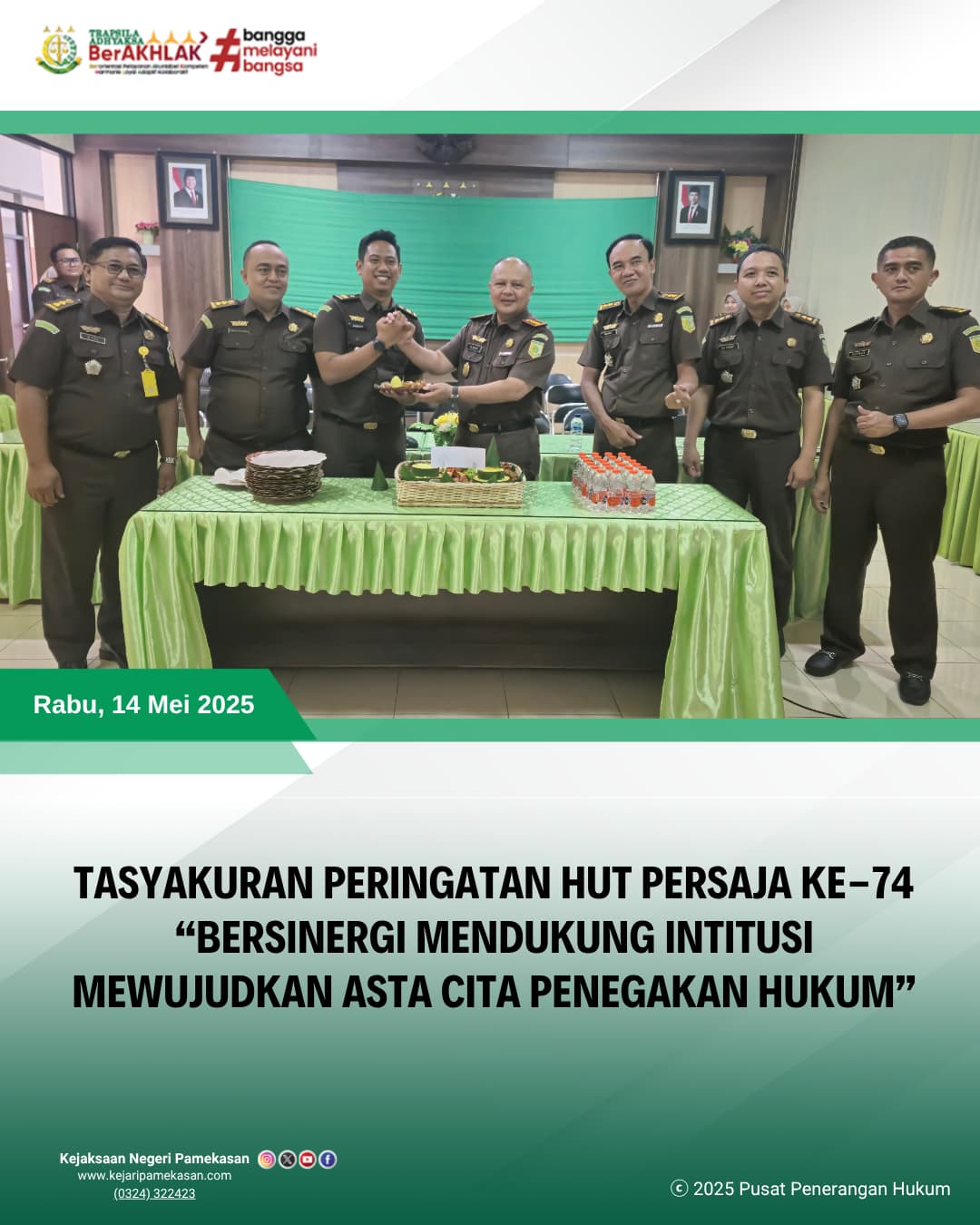 TASYAKURAN – Rabu, 14 Mei 2025, Bertempat di Aula Kejaksaan Negeri Pamekasan dilaksanakan kegiatan Tasyakuran Peringatan HUT PERSAJA Ke-74 “Bersinergi Mendukung Institusi Mewujudkan Asta Cita Penegakan Hukum”.