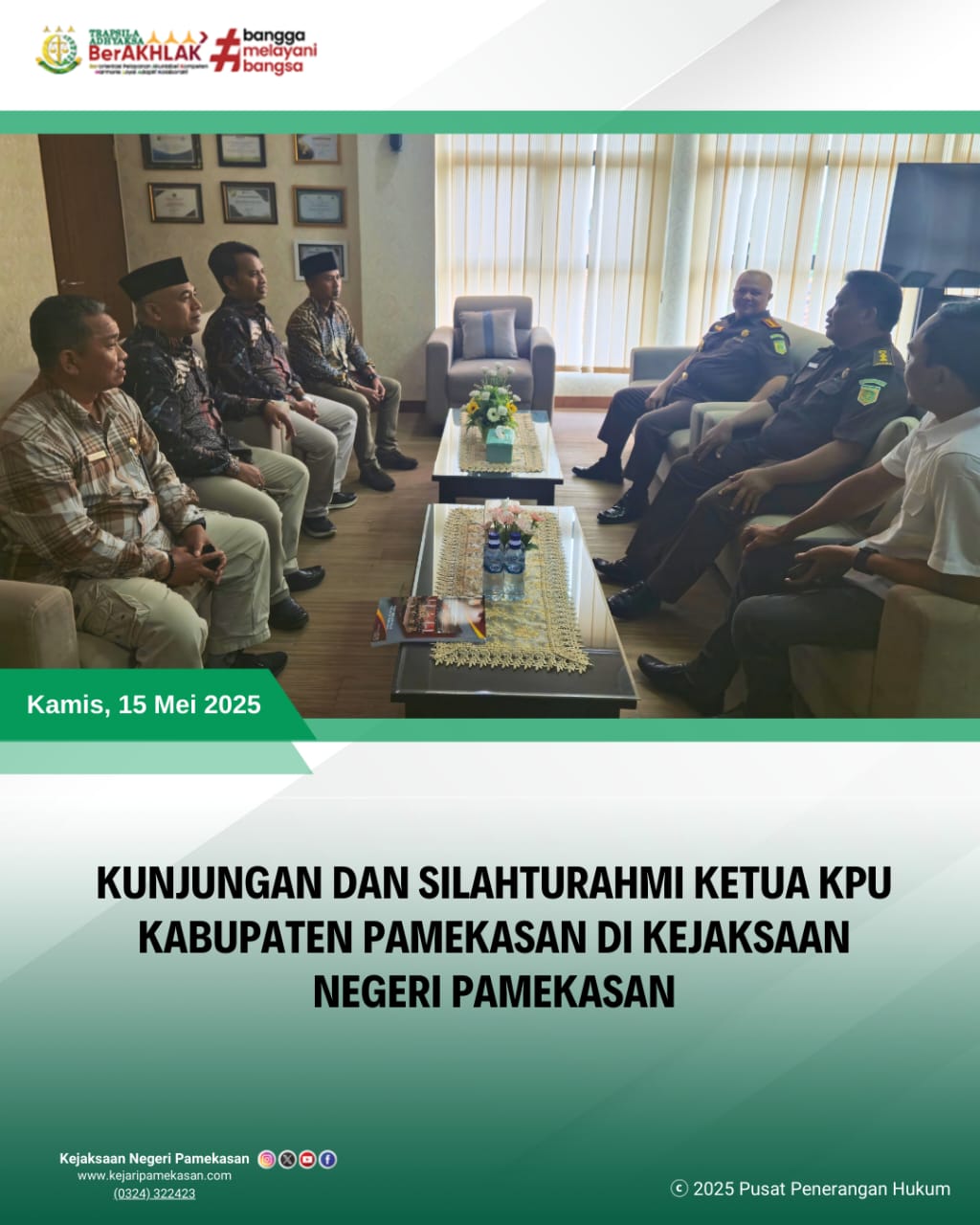 Kamis, 15 Mei 2025, Kepala Kejaksaan Negeri Pamekasan, Kepala Seksi Tindak Pidana Umum dan Plh Kepala Seksi Intelijen Kejaksaan Negeri Pamekasan menerima kunjungan silaturahmi dari Kepala KPU Kabupaten Pamekasan bertempat di Ruang Kepala Kejaksaan Negeri Pamekasan.