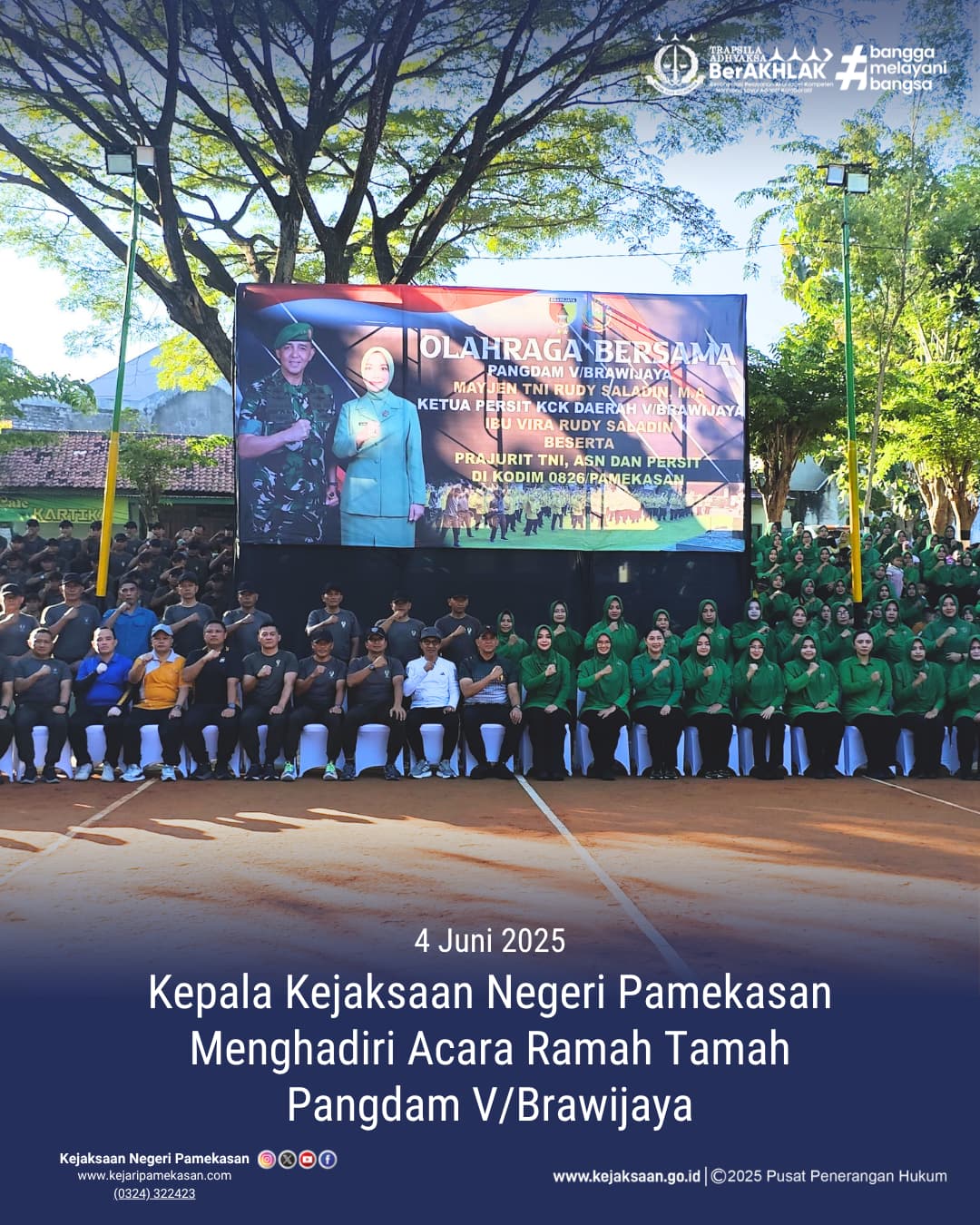 RAMAH TAMAH admin June 4, 2025 1 min read Rabu, 4 Juni 2025, Kepala Kejaksaan Negeri Pamekasan menghadiri acara Ramah Tamah oleh Pangdam V/Brawijaya bersama dengan Forkompinda, Ulama dan Masyarakat di Makodim 0826/PMK. Continue Reading Previous Previous post: Upacara Peringatan Hari Lahir Pancasila Tahun 2025Next Next post: MUSRENBANG Leave a Reply Cancel replyYour email address will not be published. Required fields are marked *Comment * Name * Email * Website Save my name, email, and website in this browser for the next time I comment. Related News HUT RI-80 HUT RI-80 August 17, 2025 August 7, 2025